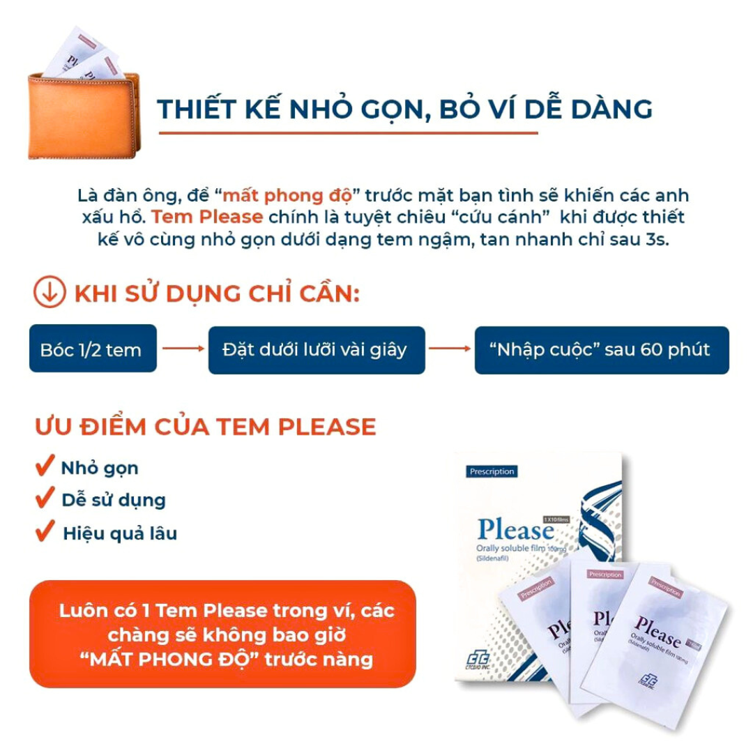 Tem Please orally sobuble film 100mg Là dạng phim dùng để ngậm tan trong miệng,có tác dụng điều trị các rối loạn cương dương, là tình trạng không có khả năng đạt được hoặc duy trì cương cứng đủ để thỏa mãn hoạt động tình dục do các nguyên nhân khác nhau như bệnh về mạch (do đái tháo đường), phản xạ thần kinh (tổn thương dây gai)...