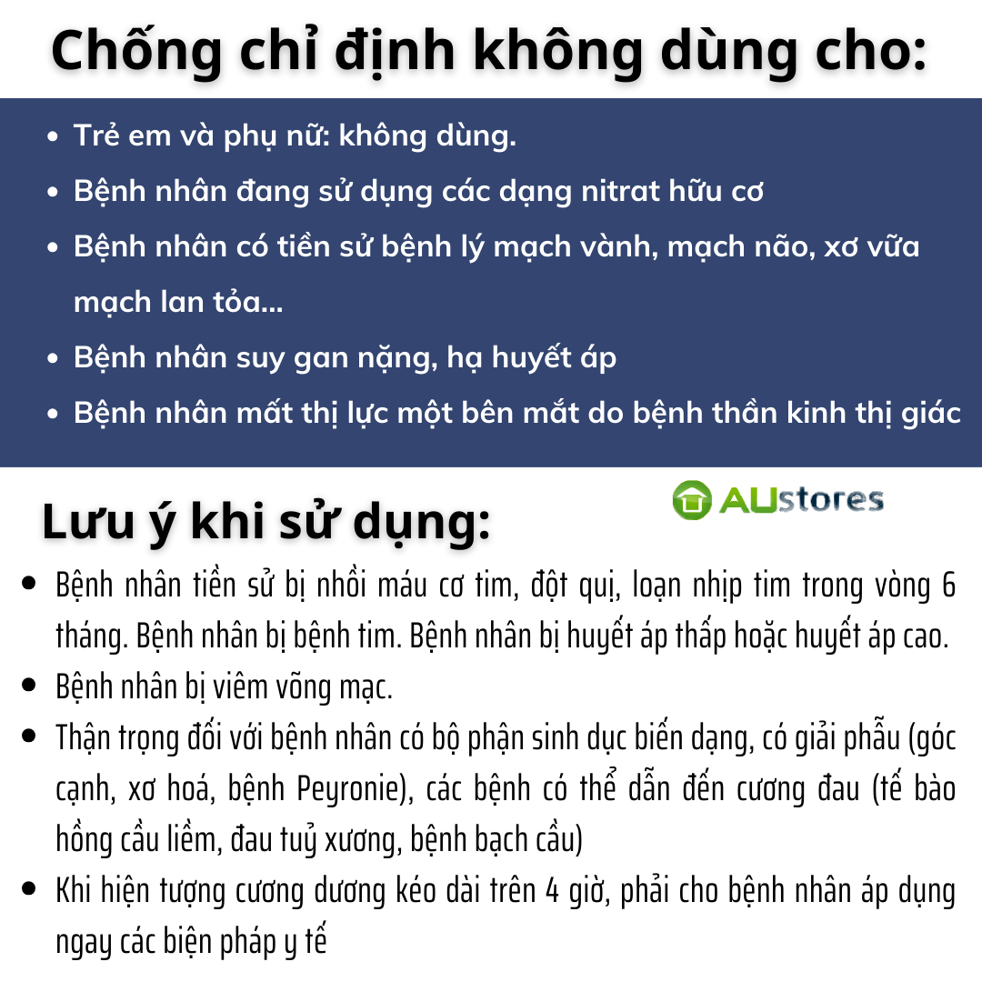 Không nên kết hợp với các thuốc, sản phẩm ức chế PDE5 và thuốc điều trị tăng huyết áp động mạch phổi khác. Khi gặp các tác dụng không mong muốn thì nên đến ngay các cơ sở y tế để lập tức điều trị.